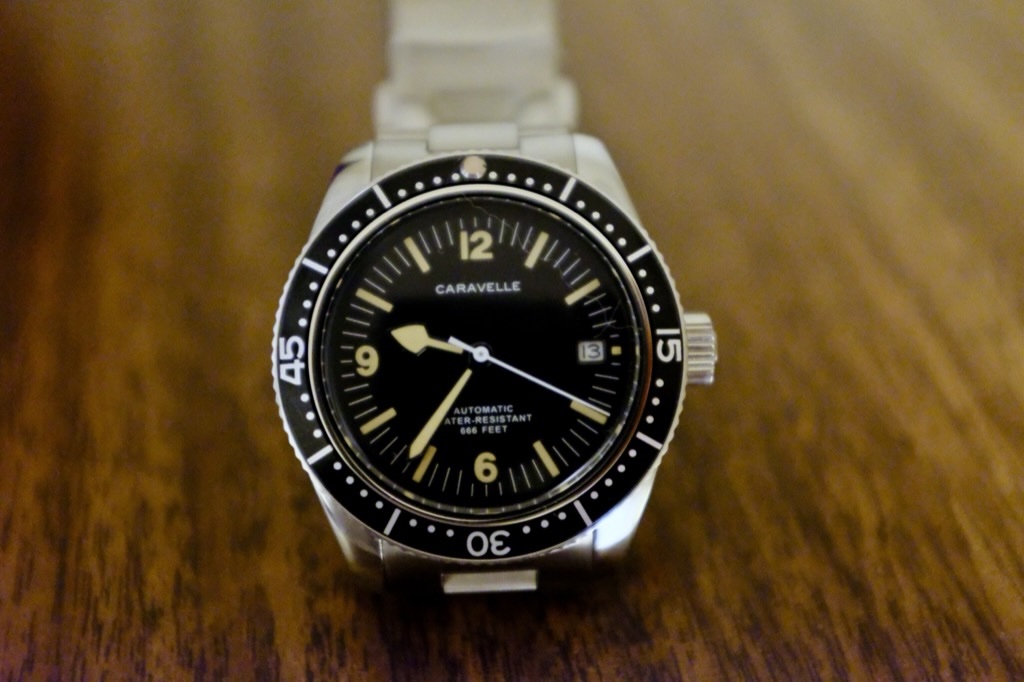 The Sea Hunter has a hacking second-hand and a date window. The numerals and indices are lumed, as is a round pip on the bezel at 12 o’clock. The hour-hand has a spade (is that the correct term for this shape?) on the tip which, surprisingly, makes it easier for me to distinguish the hour. The second-hand is white and un-lumed. There is slight distortion along the circumference of the crystal which feels like it’s slightly domed. The crown is engraved with a "C" for Caravelle.