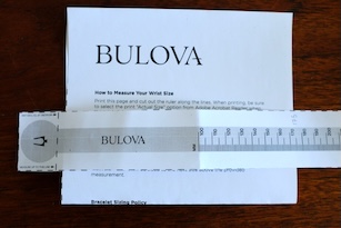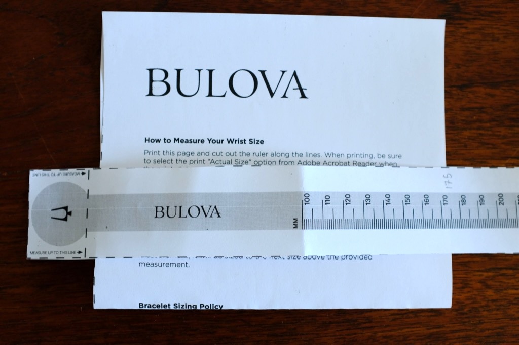 One of the options when ordering from Bulova is that the bracelet can be pre-size to fit your wrist. On the order-page, there is a link to a sizing guide (PDF) that you print, cut-out the ruler and wrap it around your wrist, adjusting it until you get a comfortable fit. The number has to be rounded-up to the nearest 10mm; my 175mm wrist measurement was rounded up to 180mm.