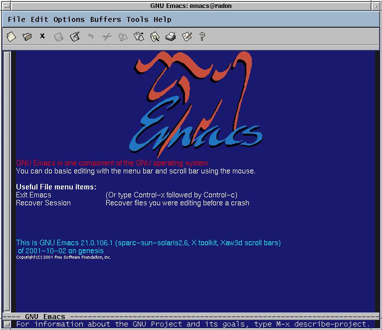 The Prime DirectiveRMS liked this particular re-designed logo because "GNU" and "Emacs" were clearly visible:From: RMS To: Luis Fernandes Subject: Re: Revised Emacs logos Date: Sat, 20 Jan 2001 21:00:45 -0700 (MST) None of these works for me. Some of them make the gnu clear enough, but finding "Emacs" is a puzzle, assuming you KNOW it is supposed to be there. If you don't know, you would never guess. This is good enough to make a nice amusing picture, but not good enough for a logo. The Emacs logo should scream "Emacs",